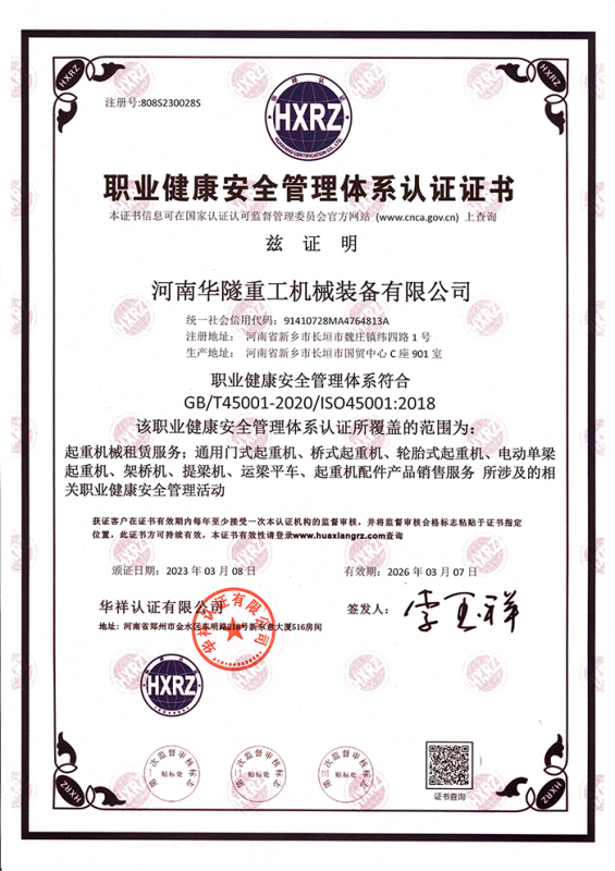 河南華隧重工機(jī)械裝備有限公司主要從事通用門(mén)式起重機(jī)、橋式起重機(jī)、電動(dòng)單梁起重機(jī),輪胎式起重機(jī)、架橋機(jī)、提梁機(jī)、遠(yuǎn)梁平車(chē)、鋼絲繩電動(dòng)萌蘆、卷?yè)P(yáng)機(jī)、起重配件制造、銷(xiāo)售:起重機(jī)械租賃、安裝和維修,起重設(shè)備園收,機(jī)械設(shè)備維修,鋼結(jié)構(gòu)工程承包,橋梁工程及技術(shù)咨淘服務(wù),銷(xiāo)售五金制品、機(jī)電設(shè)備:建設(shè)工程監(jiān)理,建設(shè)工程設(shè)計(jì),各類(lèi)工程建設(shè)活動(dòng),建筑勞務(wù)分包,建筑物折除作業(yè),施工作業(yè),工程管理服務(wù),土石方工程施工,裝如發(fā)運(yùn)。  公司已通過(guò)IS0國(guó)際質(zhì)量、環(huán)境、健康與安全三合一標(biāo)準(zhǔn)認(rèn)證,特種設(shè)備制造許可證和特種設(shè)備安裝改造維修許可證。擁有完熟的質(zhì)量管理體系。嚴(yán)格的管理制度,強(qiáng)大的生產(chǎn)能力和先進(jìn)的檢測(cè)手段,在保證產(chǎn)品質(zhì)量的同時(shí),也具備了極強(qiáng)的市場(chǎng)競(jìng)爭(zhēng)力。  公司堅(jiān)持科技創(chuàng)新為理念,產(chǎn)品質(zhì)量為核心,注重信譽(yù),建立了減信可靠、快捷、思速。便利周到的售后服務(wù)網(wǎng)絡(luò)。  我們擁有的技術(shù)專(zhuān)家和技術(shù)服務(wù)隊(duì)伍為客戶提供充善的售前技術(shù)支持和全天候的售后服務(wù)體系,讓您無(wú)后顧之憂,享受一站式的超值服務(wù)。  “華隧重工,伴您成功“是華隧重工永遠(yuǎn)的宗指,真被的希望與各界朋友攜手并進(jìn)。共創(chuàng)輝準(zhǔn)!